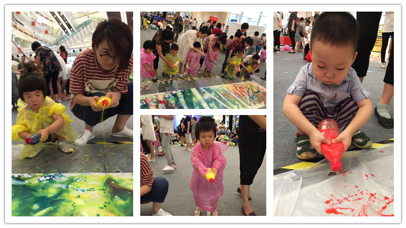 教玩具装满颜料的水枪进行随意的射击,让宝宝在游戏中观察色彩线条的变化,在趣味性十足的游戏中不知不觉掌握不同颜色,感受线条美。