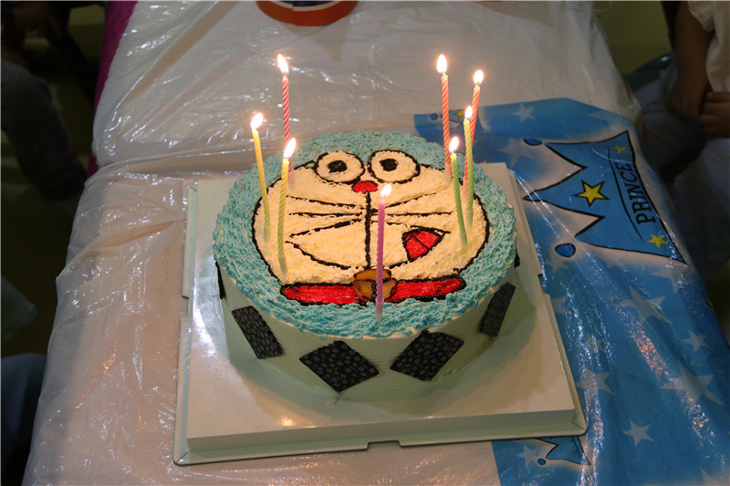 放生日歌、熄灯,老师和宝宝一起迎接蛋糕进来,切蛋糕,品尝美食;